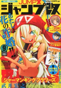 And from the official JumpX twitter… here’s the front and back cover of Shaman King Flowers volume 1. On the back cover on the wrap-around ad, you can see the alternative cover that you get for free with this month’s issue of Jump X (Kai):