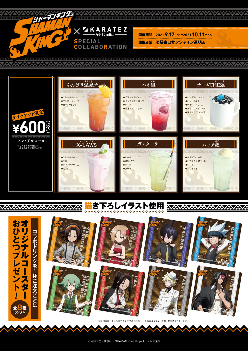 Throughout the event 6 Shaman King-inspired drinks can be ordered from any of the 7 venues. Each drink costs 600 yen and will be available via carry-out only. Drinks may be discontinued temporarily if they run out of ingredients and do not contain any alcohol. With each drink you will receive a random Shaman King coaster while supplies last. The drink name and the ingredients are listed below: