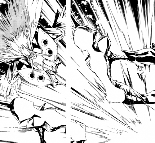 Our story continues where it left off in chapter 13. Hana tries to attack, but it blocked by Gakko Ibuki’s Orge Hunter O.S.. He appears to be using a technique called KÖNIG DEFENSER that can repel Hana’s O.S. After a few more attempts, Gakko is becoming quite pleased with his Oversoul.