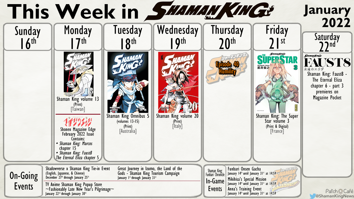 Starting on Monday the 13th volume of the Shaman King manga is back in print in Taiwan. They have about monthly releases of the volumes. Also on Monday was a new chapter of Shaman King: Marcos and Shaman King: Faust8 in Shonen Magazine Edge.