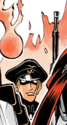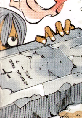 This appears to be an early concept for Marco of the X-Laws. Notice how he has a larger gun just behind Yoh’s head as well…Takei wrote in the year of his birth date onto his tombstone. Good thing he doesn’t have an end date yet!