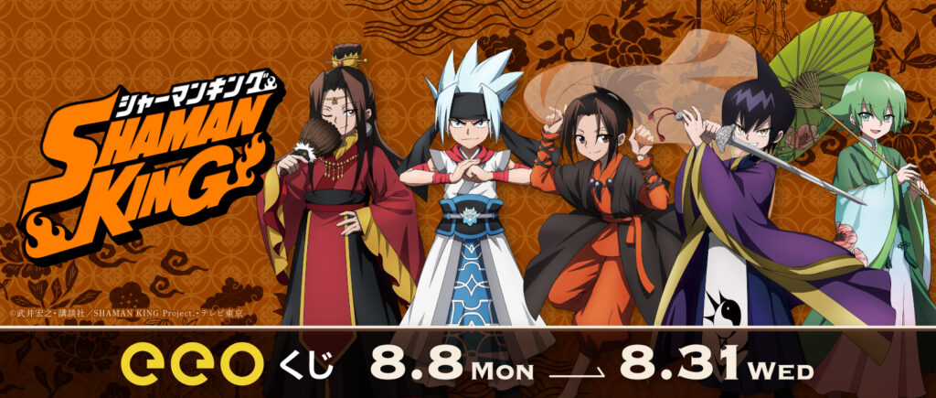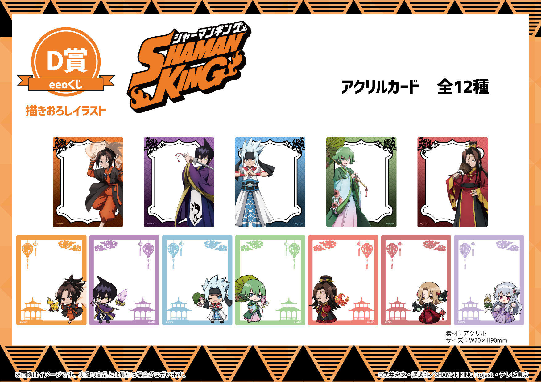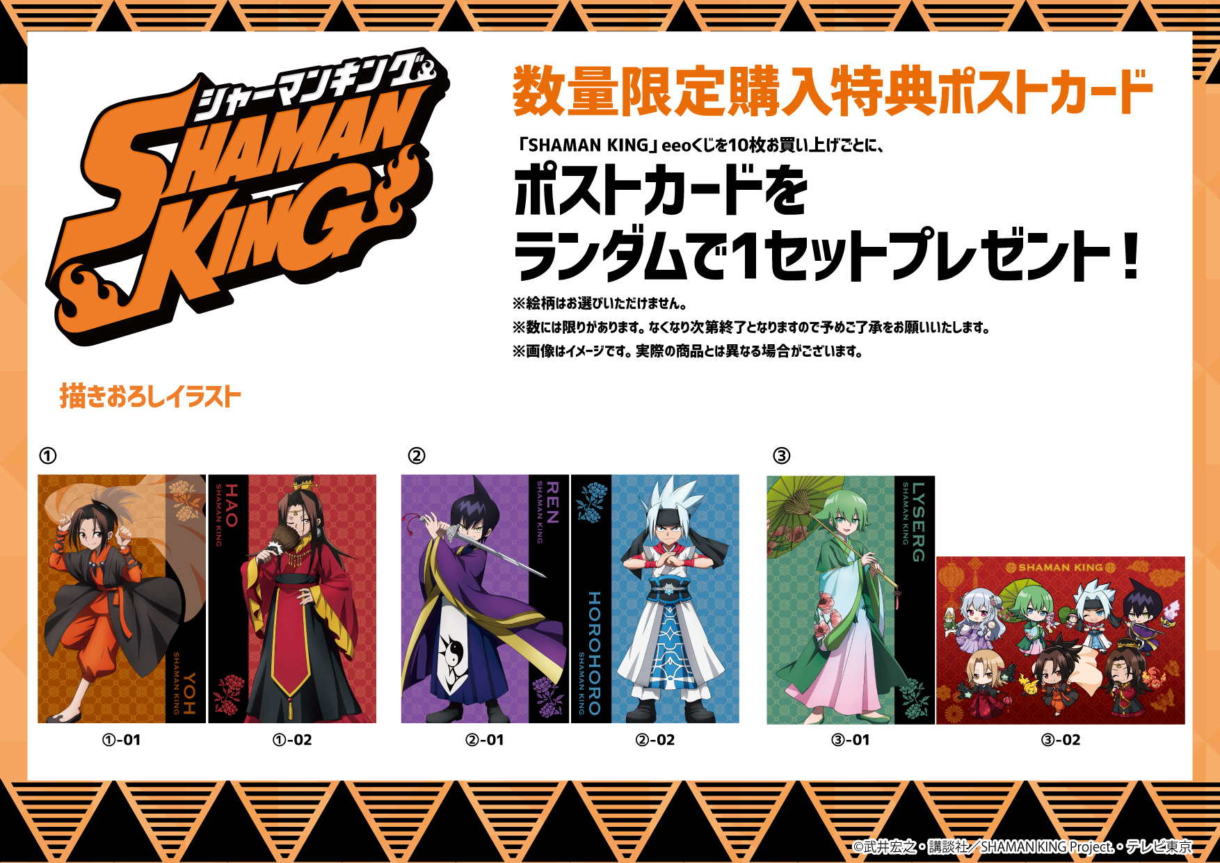 Without any promotion leading up to it, the eeo Store has opened up a brand new Shaman King online prize lottery (Kuji) for the month of August. This event started on August 8th and run through August 31st for purchasing tickets into the prize lottery. Each ticket costs 770 yen and the prizes will ship in early October. There is a flat rate shipping fee of 770 yen (or 1320 yen for Hokkaido, Okinawa, and remote islands). For every 10 tickets you purchase you will also receive a random postcard set.