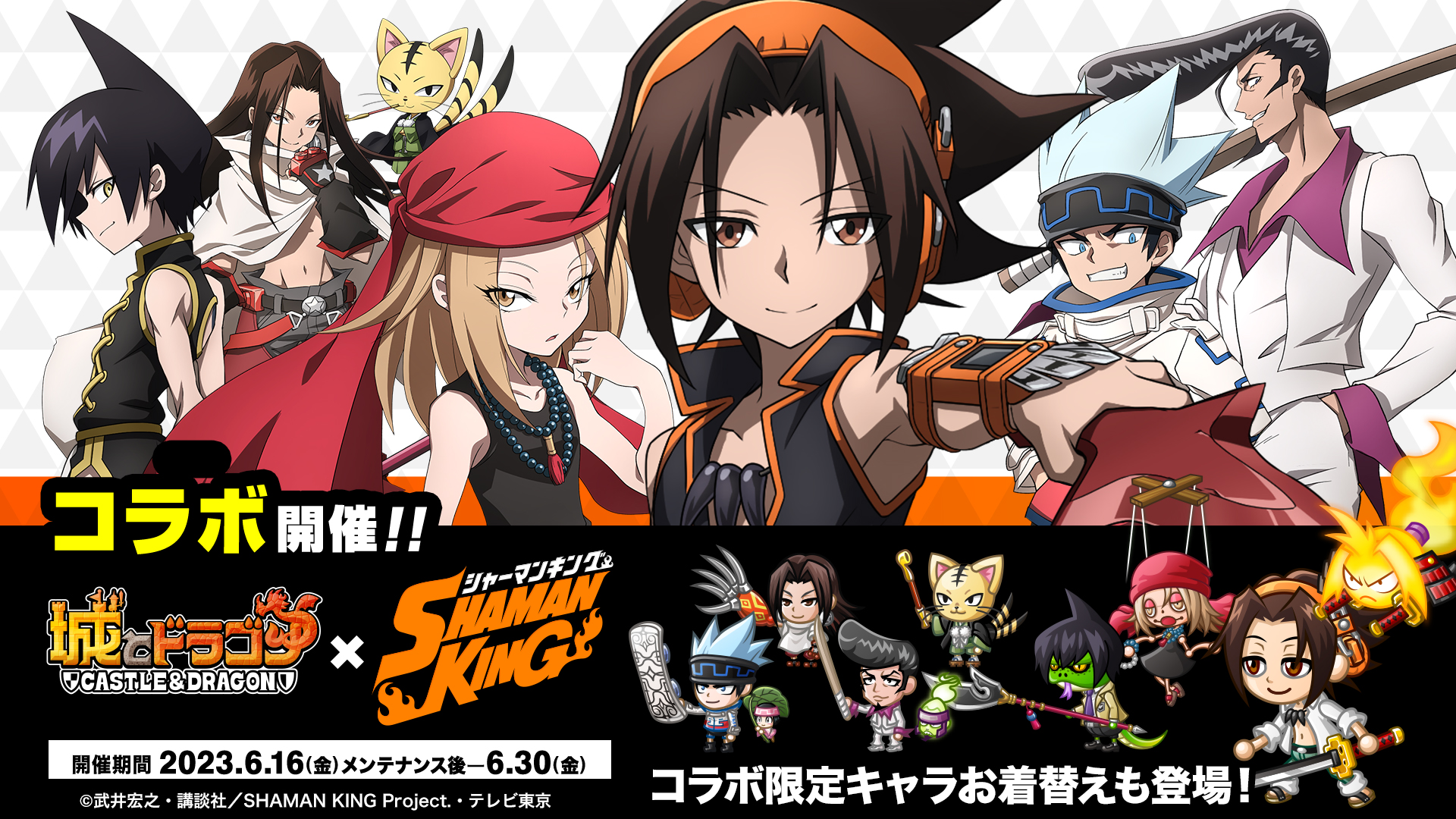 The Shaman King anime is having a second collaboration event with the Japanese mobile game “Castle & Dragon.” The first event occurred from July 29th through August 12th in 2022. The new event, which runs from June 16th through June 30th 2023, contains all of the old content along with new characters. A new collaboration website has also opened.