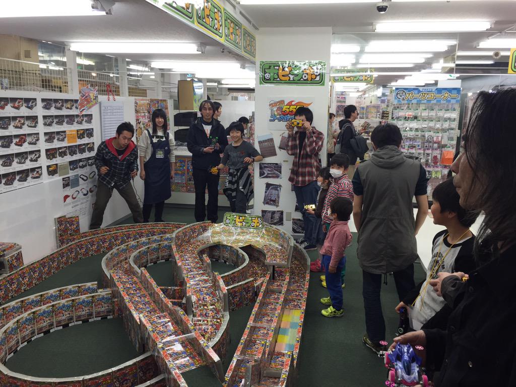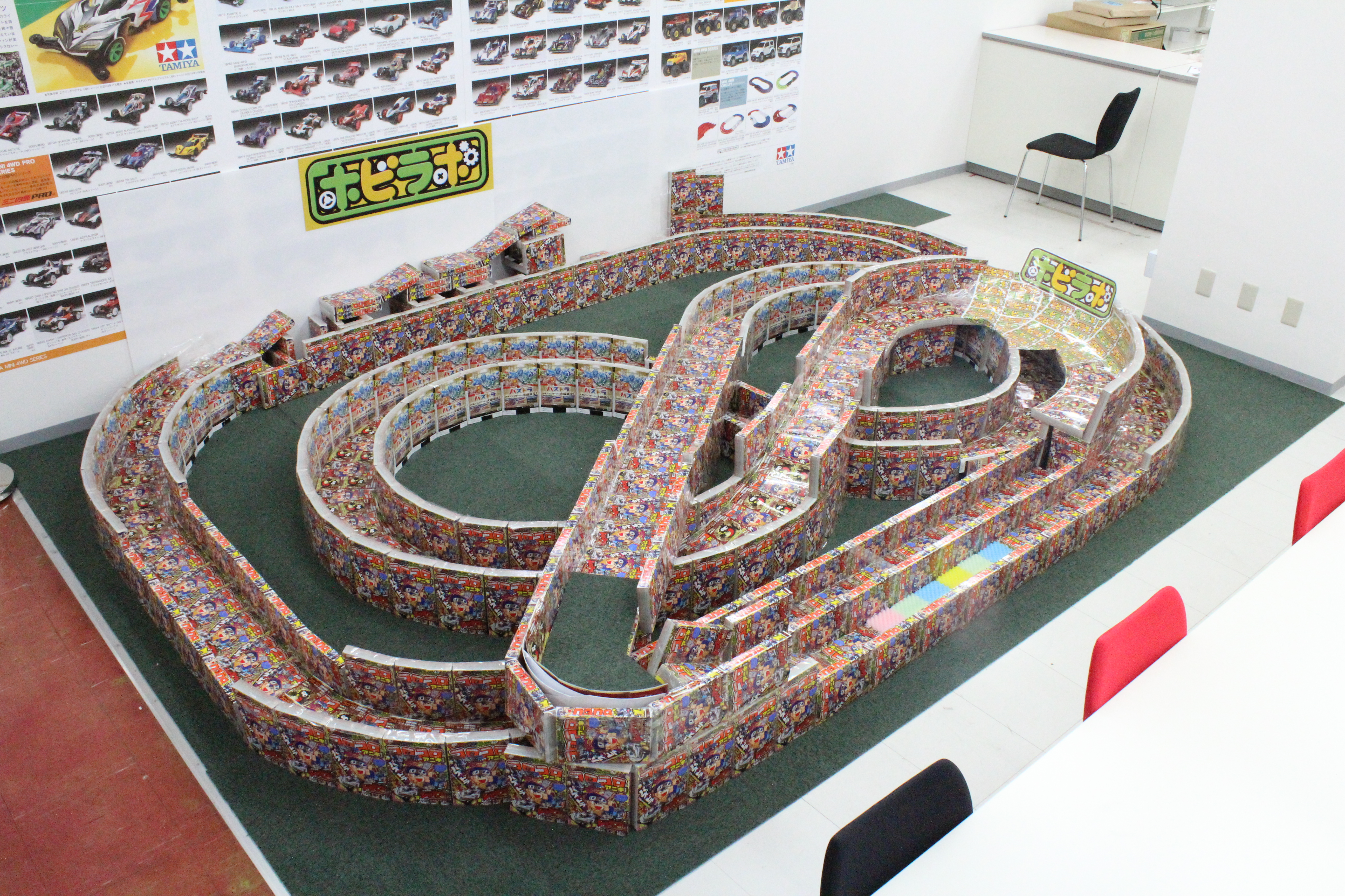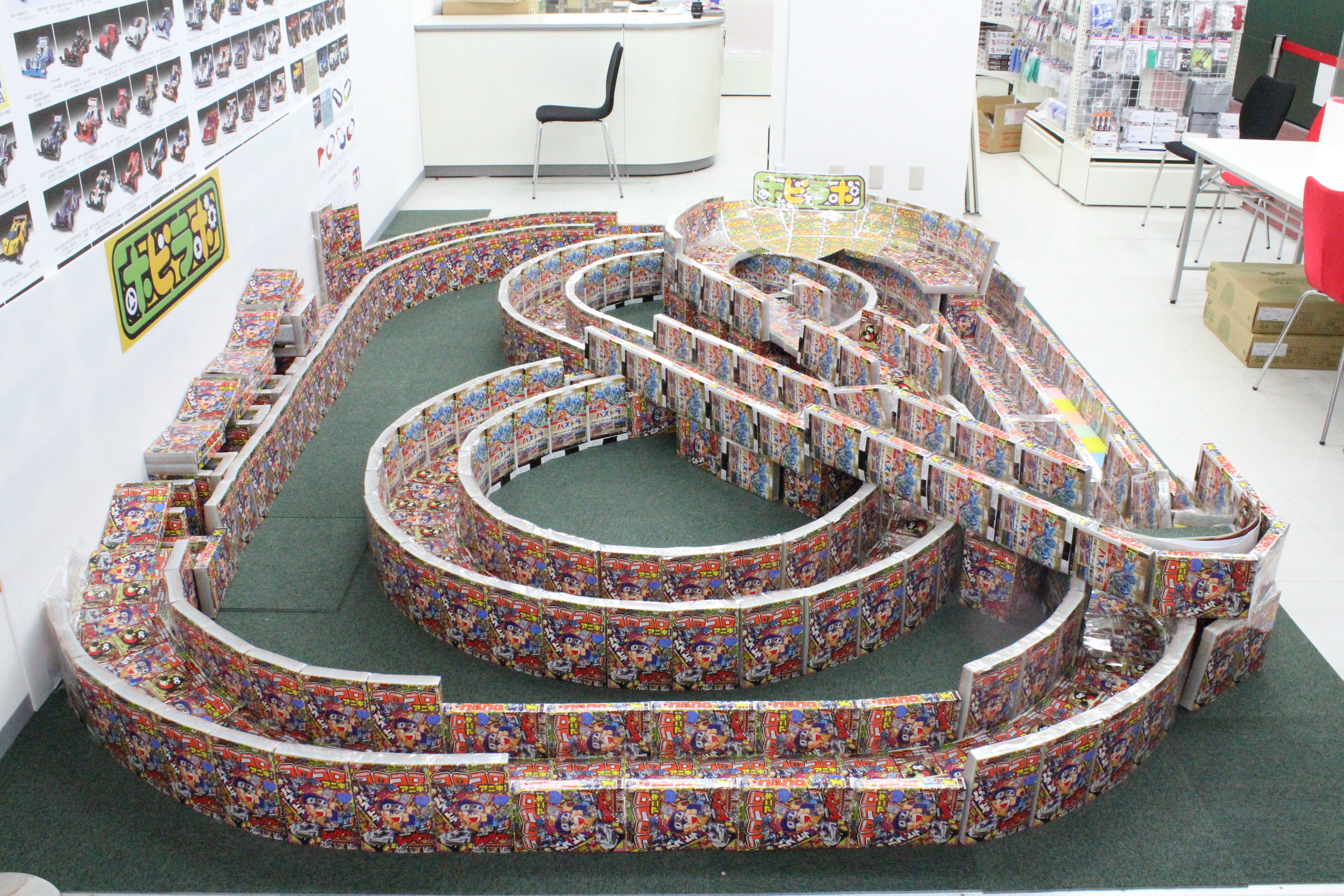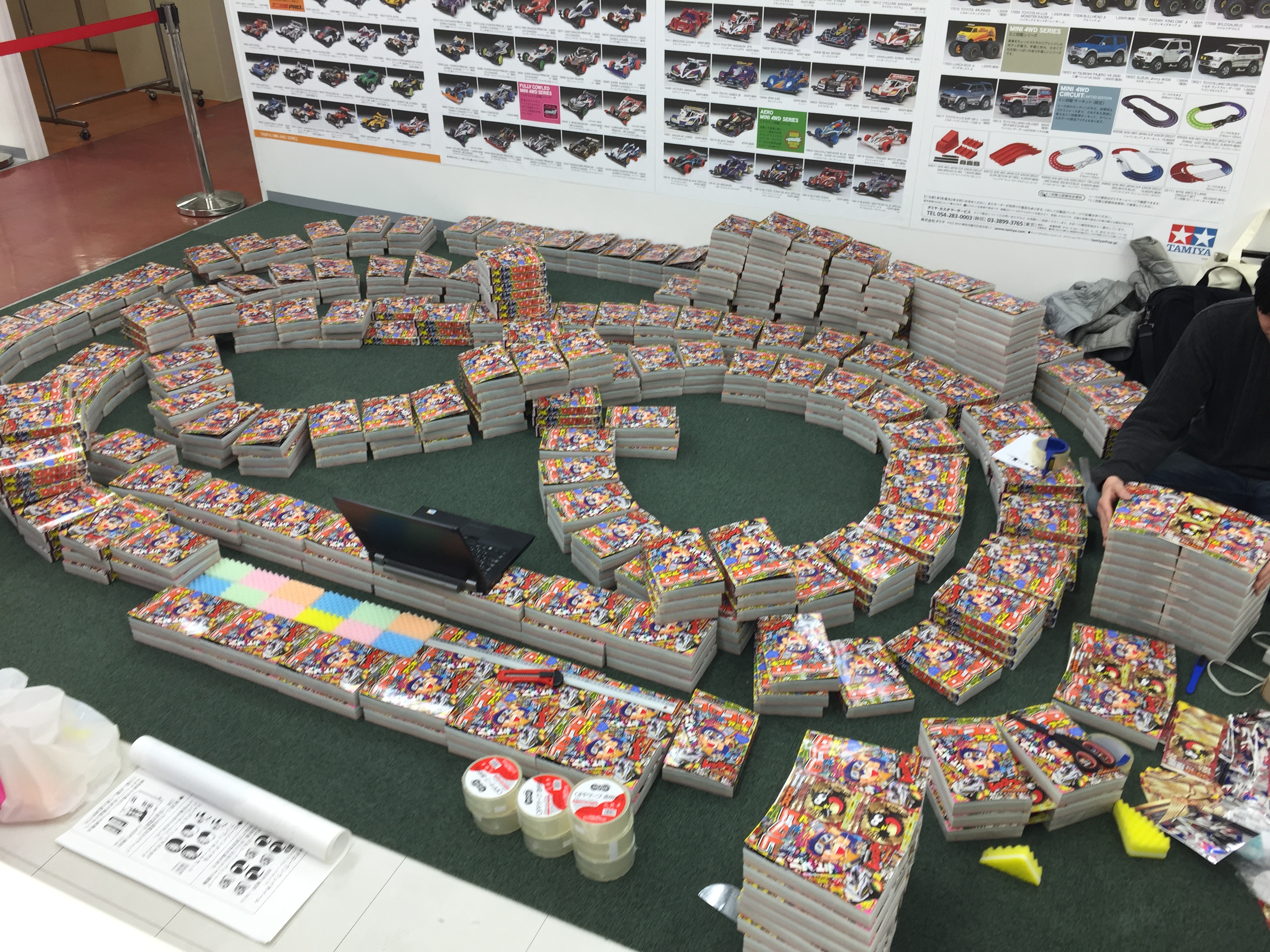 On March 29th, 2015 between 9:00-17:30, The Hobilabo Sendai Shop held a “Coro Aniki Cup” for racing Mini-4WD cars. Since the beginning of February, the shop has been planning out this racing tournament by ordering 555 copies of the first issue of Corocoro Aniki. Next they designed a track and started building out the rough layout earlier this month. For the corners of the tracks, they used form with and added one of the inserts on top.