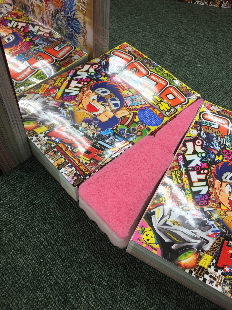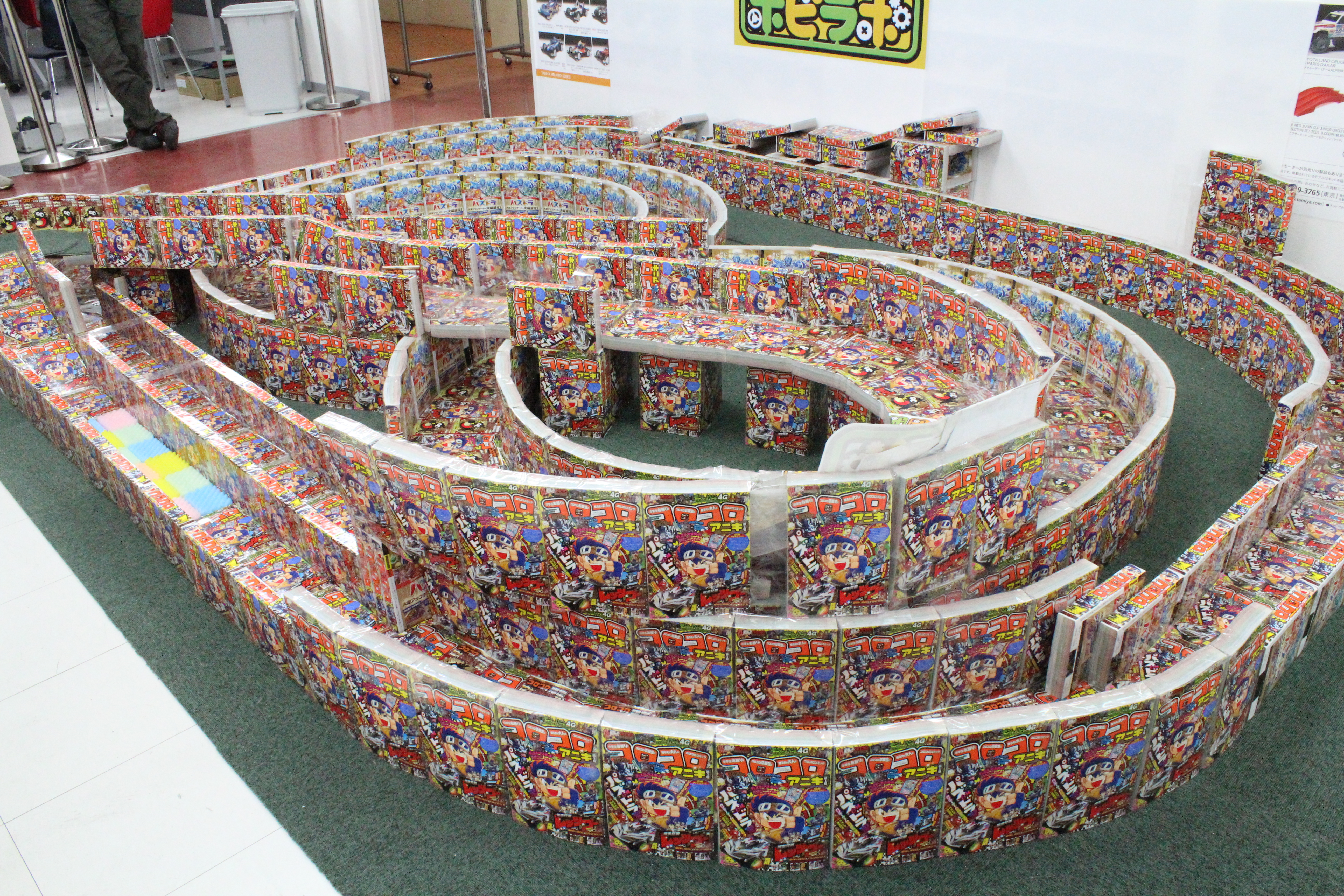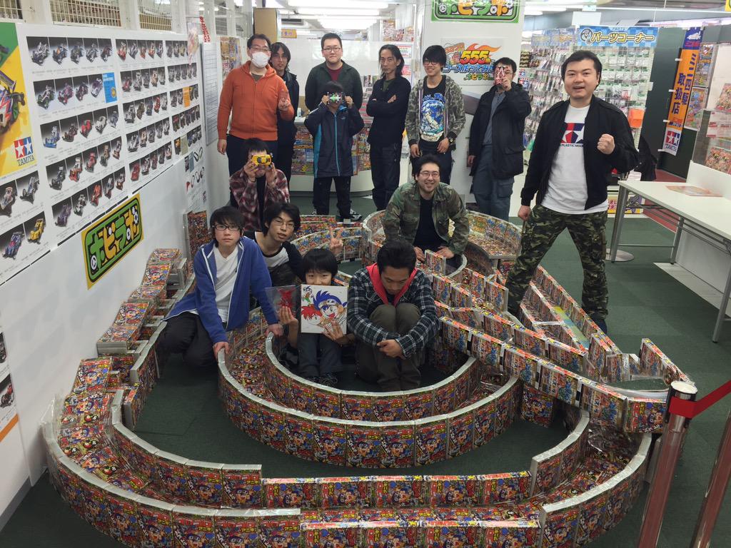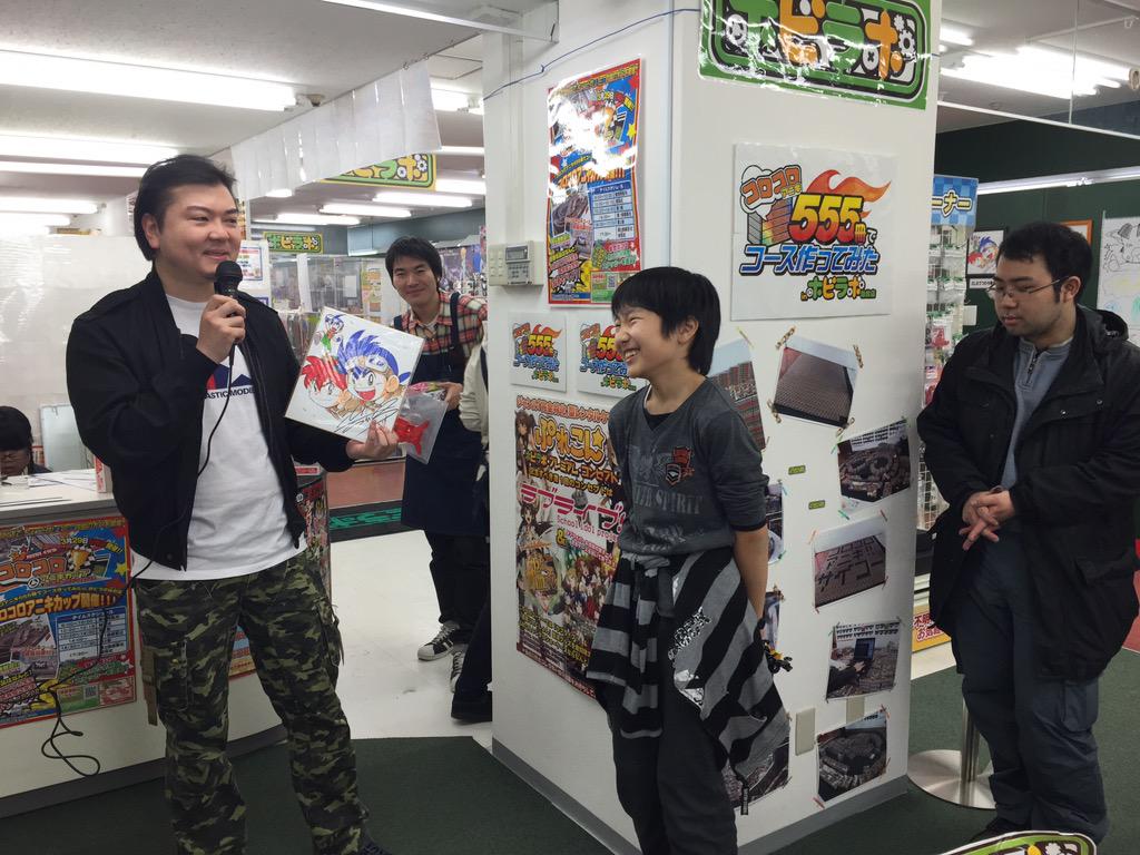 On March 29th, 2015 between 9:00-17:30, The Hobilabo Sendai Shop held a “Coro Aniki Cup” for racing Mini-4WD cars. Since the beginning of February, the shop has been planning out this racing tournament by ordering 555 copies of the first issue of Corocoro Aniki. Next they designed a track and started building out the rough layout earlier this month. For the corners of the tracks, they used form with and added one of the inserts on top.