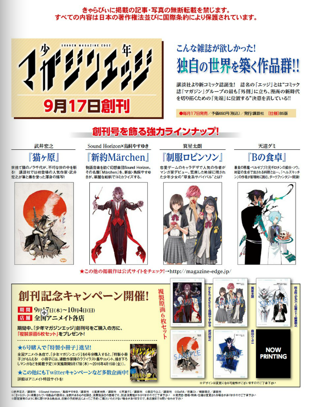 As previously reported, on September 17th, the first issue of Shonen Magazine Edge will be released in Japan. As part of the build up to this launch the editorial department has started a new Twitter campaign which includes a contest.