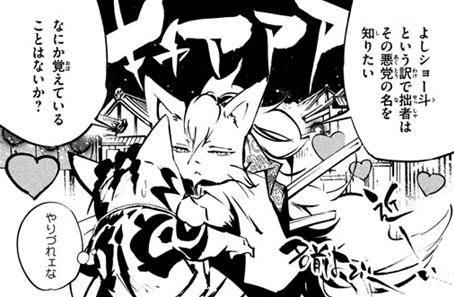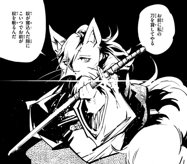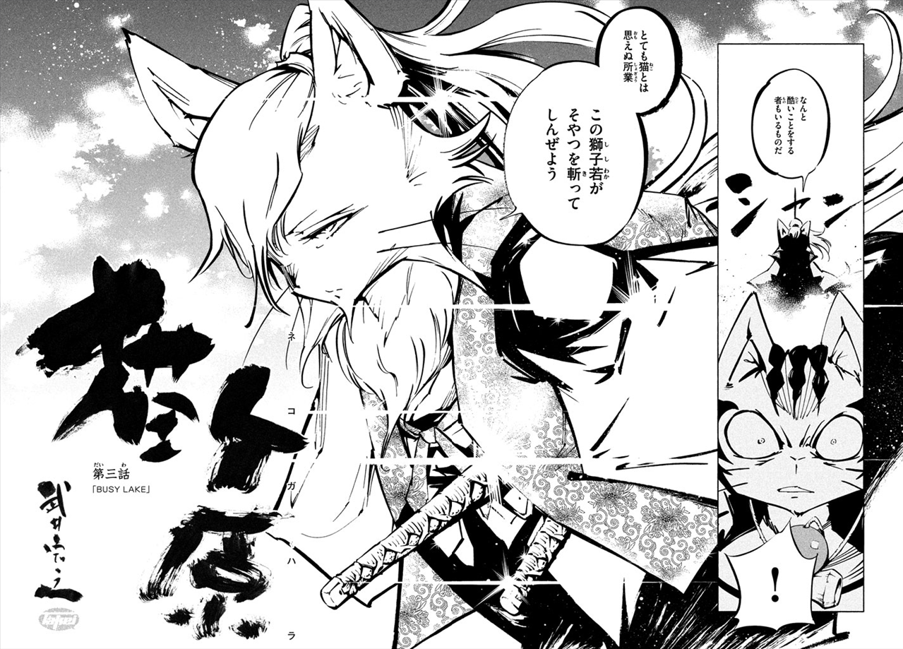 Norachiyo then draws his sword…. the gang leader looks back to the “Handsome” cat who is now missing for help… then blood splatter.