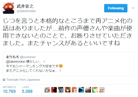 Personally, I am happy that there are (or were) offers for a new Shaman King anime. But I respect that Hiroyuki Takei wanted to have some control over the direction of the adaption and that it would meet the quality that he expects. With over 10,000 retweets, I’d expect to help some traction on some new offers to be made.