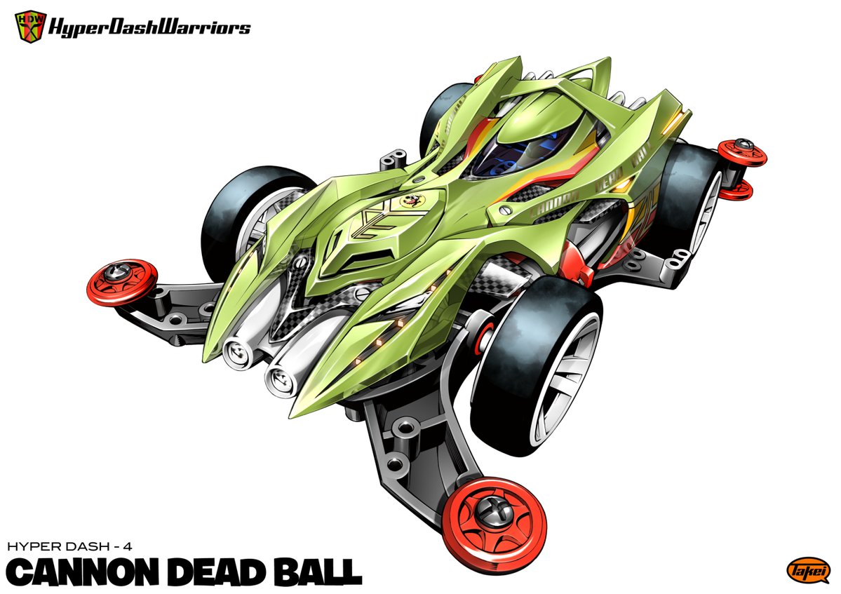 With the national “Japan Cup 2017” currently underway (the annual Mini 4WD national tournament), it has been officially announced that in Fall 2017, the “Cannon D. Ball (Brand Name)” (キャノン”D”ボール(商品名)) Mini 4WD will be released. This is yet another Mini 4WD car designed by Hiroyuki Takei in relation to his Hyper Dash! Yonkuro manga that is currently running in the Corocoro Aniki magazine. In the issue that released earlier this week, this same image (as shown left and posted on Takei’s twitter) was printed and he added that there is a “secret” about this car that has yet to be revealed.