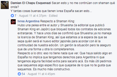 On August 11th, the current Argentina publisher of Shaman King, Ivrea Argentina, commented on Facebook about the matter. Below is the rough English translation:
