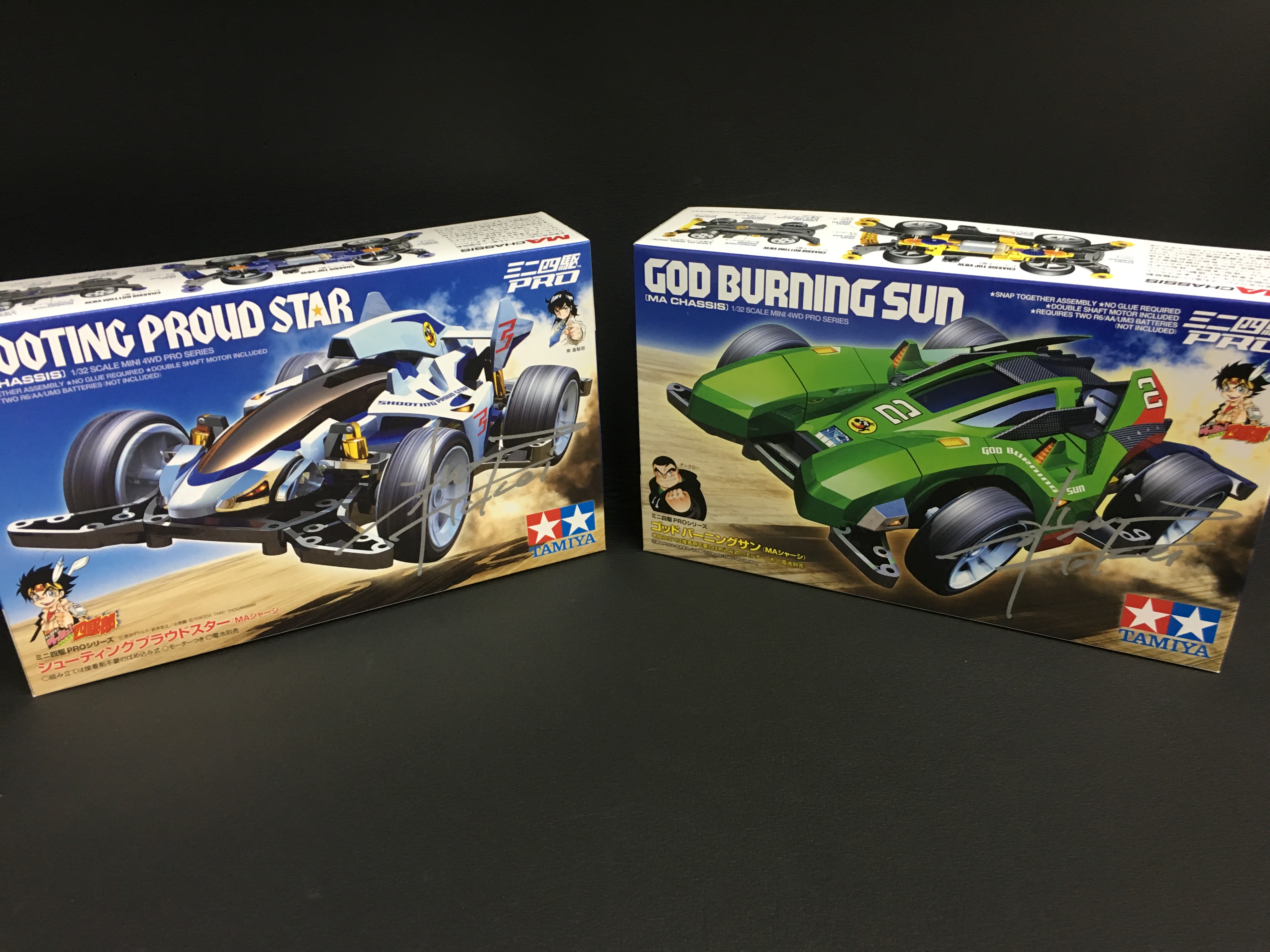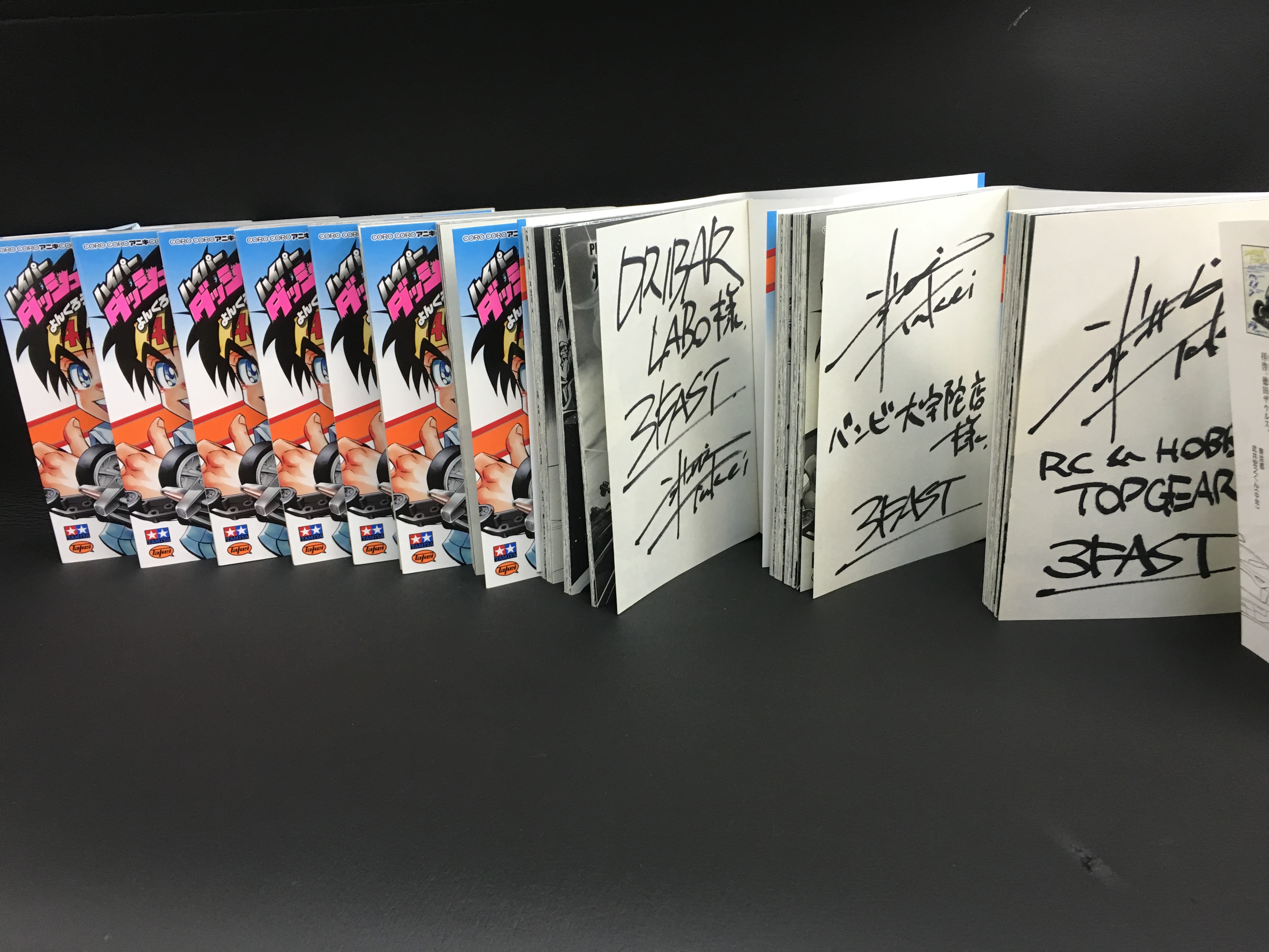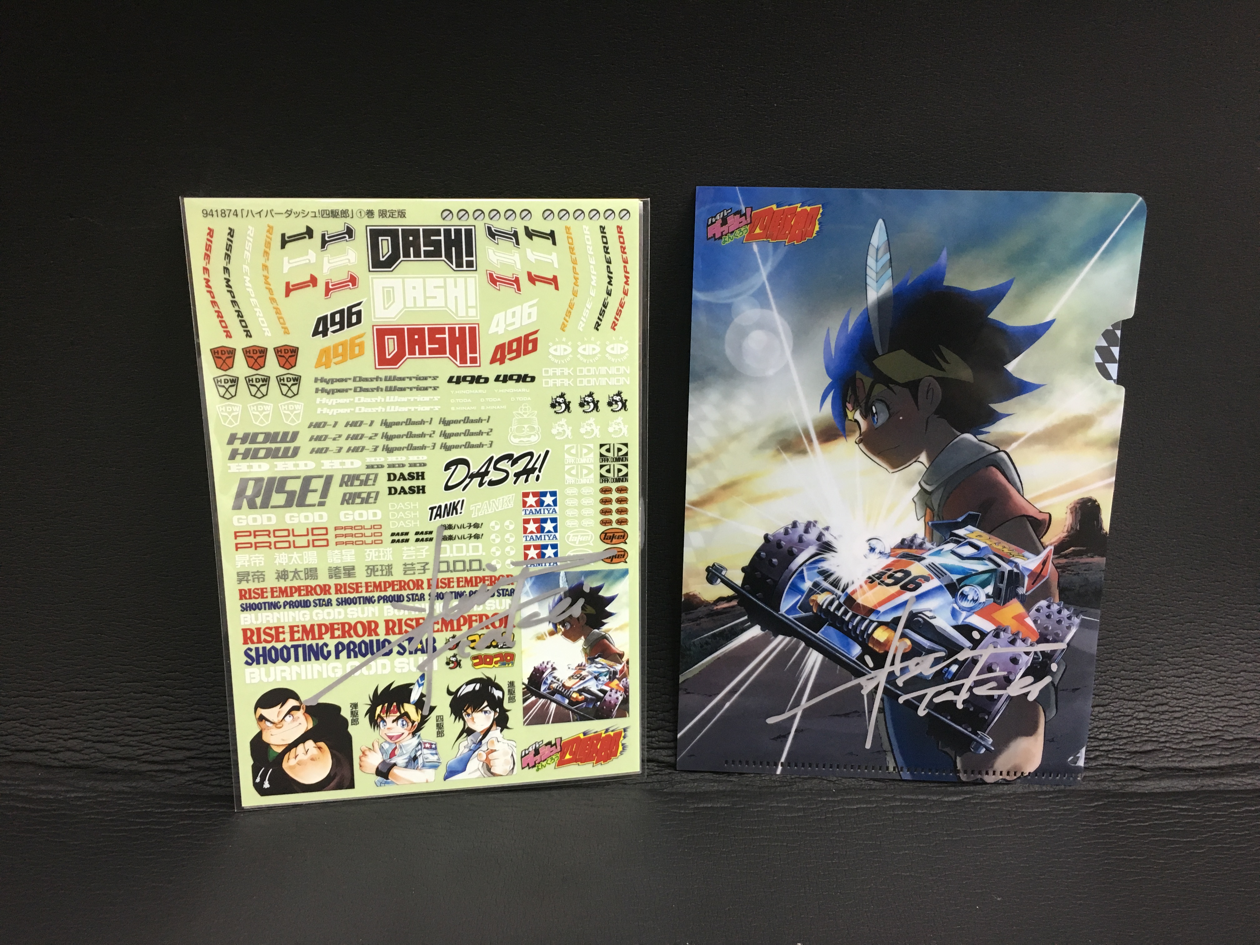 Additionally, there will be a lottery held at the event for children in Junior High and younger for all participants with the prize being one of five autographed copies of the Hyper Dash! Yonkuro manga. Other Mini4WD stores participating in the 3F championship will also be receiving additional signed volumes to be distributed independently prior to October. Throughout the championship they will be also giving out event prizes of signed copies of the mini4WD kits and additional promotional materials (as shown below).