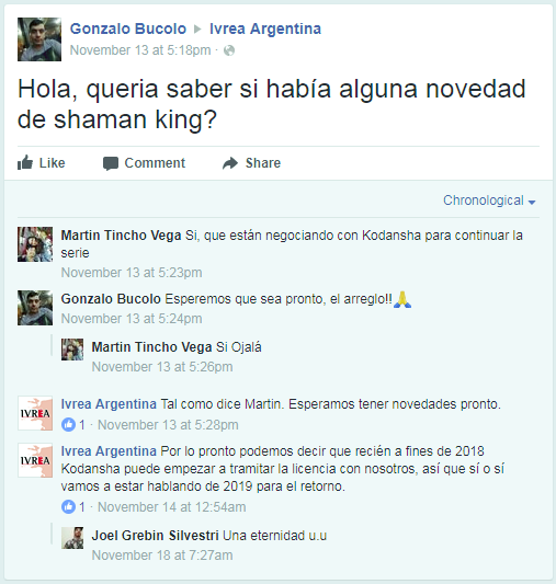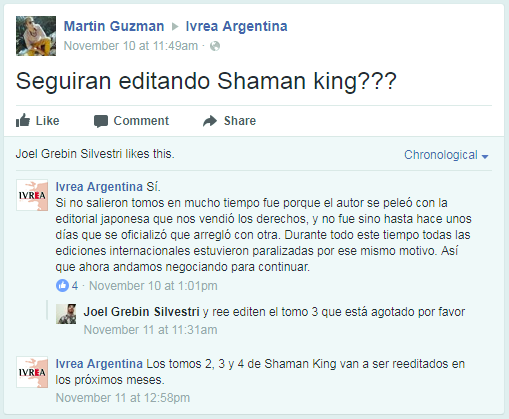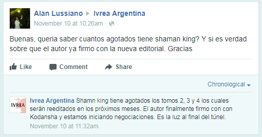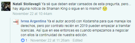 Starting on November 10th, Ivrea Argentina did respond to some posts which are roughly translated below. The recap is that it appears that International publishers can still reprint previously approved/released volumes in 2017 & 2018. This falls in line with some other international manga publishers who have been reprinting volumes over the last couple of months. However, it appears that in order for new volumes to be published, they will need to be renegotiated for the rights. For Argentina, it appears the earliest new volumes would be allowed will be in 2019 as they may need to wait until other contracts/rights expire. This is only reported from one publisher, but it seems to indicate the Kodansha can’t officially create new contracts until 2019 even though they are the current license holder. Volume 19 of the Shaman King manga was ready for print, but now appears to be delayed until 2019 in Argentina.