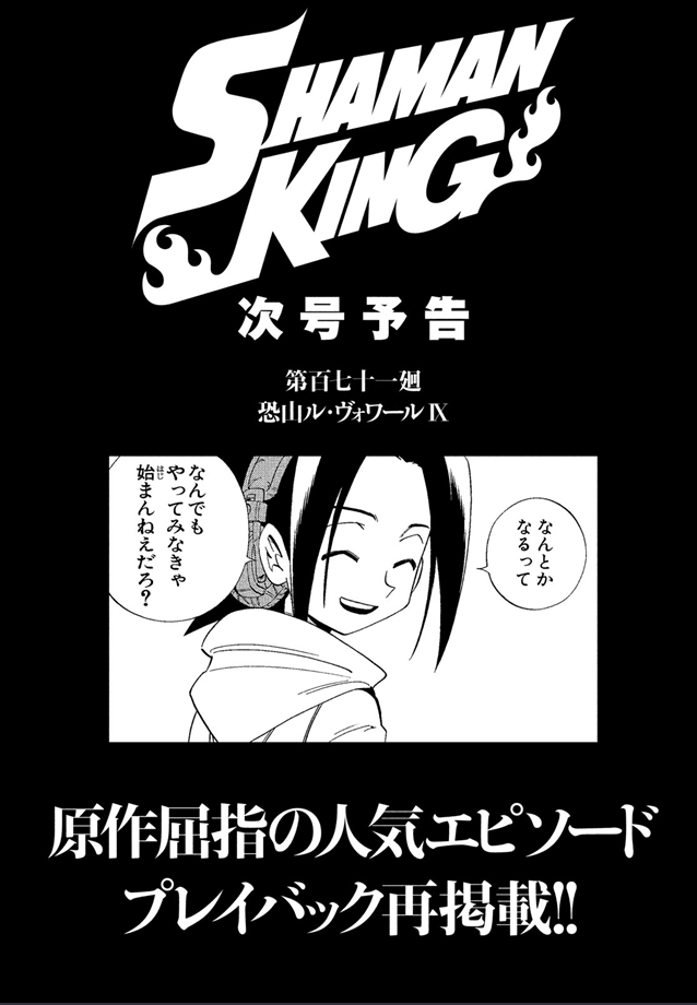 Today, January 17th, the February issue of Shonen Magazine Edge was released in Japan, which contained a special reprint chapter of the first Shaman King manga chapter and featured Yoh on the cover. It was also announced in the issue that next month will also feature another reprint Shaman King chapter. They are jumping ahead to chapter 171 “Osorezan Revoir IX (9)” (恐山ル・ヴォワール IX) which will be in the March issue, on sale in Japan on February 17th in Shonen Magazine Edge with another chapter of Nekogahara. This was the first chapter in volume 20 of the original Shaman King compiled volume print from Shueisha. The special reprint chapters are using the modifications from the original Kang Zeng Bang and Remix releases, with the logos updated to the new Shaman King logo for Kodansha.