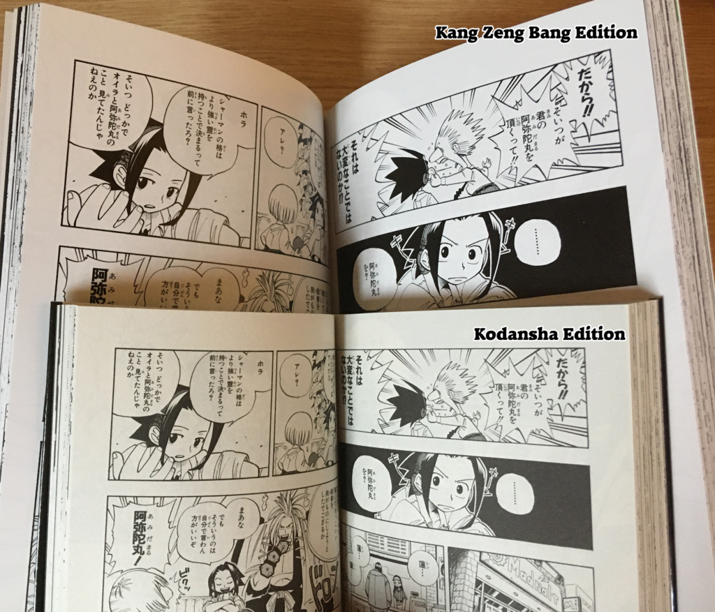 You’ll notice that the Kang Zeng Bang edition is much larger than the other editions. Paper quality-wise, outside of the Kang Zeng Bang, they are roughly the same. You can see some of the modifications between the versions if you look at Yoh in the upper left panel.