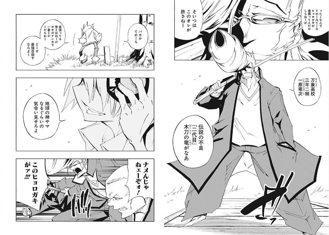 This young version of Dr. Docult and his gang want to steal the tile of “Funbari’s strongest” away from Hana, but since he’s a strong shaman and they’re just humans they have nothing to do against him! Also this guy calls himself “Ryu of the wooden sword the second” haha funny, but Takei don’t you dare turn him into one of the good guys.[/spoiler]