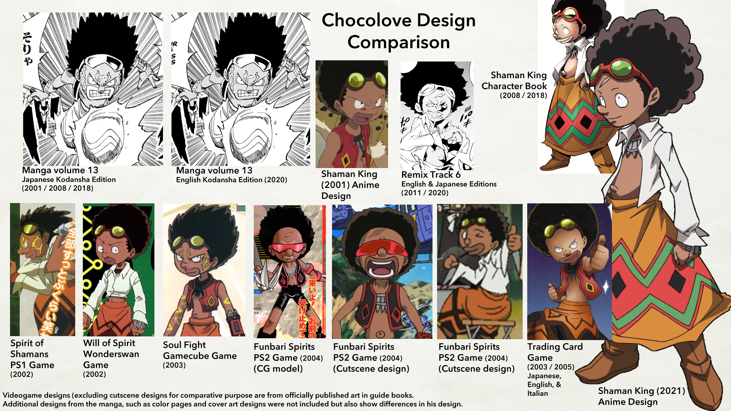 Throughout the multiple adaptations of the Shaman King series, Chocolove’s design has had some changes. In the English releases (anime and manga) his name was also changed to “Joco”, but this can vary by region. Below is a sampling of some of the character designs that Chocolove has had over the years (as produced directly by Hiroyuki Takei or games released as a full Shaman King title):