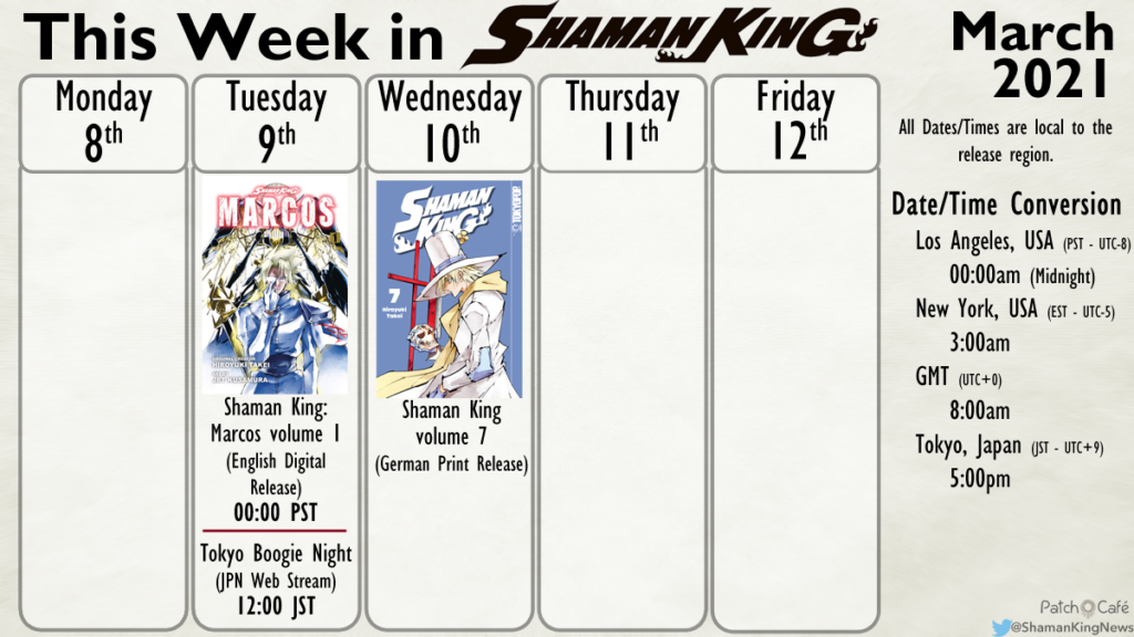For this week there are two big highlights that occur on Tuesday March 9th. The Tokyo Boogie Night episode that recently aired on Japanese radio broadcast will have it’s web stream debut on Tuesday March 9th at Noon. Due to time zones, this may actually release on Monday for some (such as EST and PST time zones) in the USA. This stream will be notable as it contains a good portion of the new Shaman King anime’s opening theme “Soul Salvation.” A tweet on our news feed (@ShamanKingNews) will be made when available (with the timecode to jump to).
