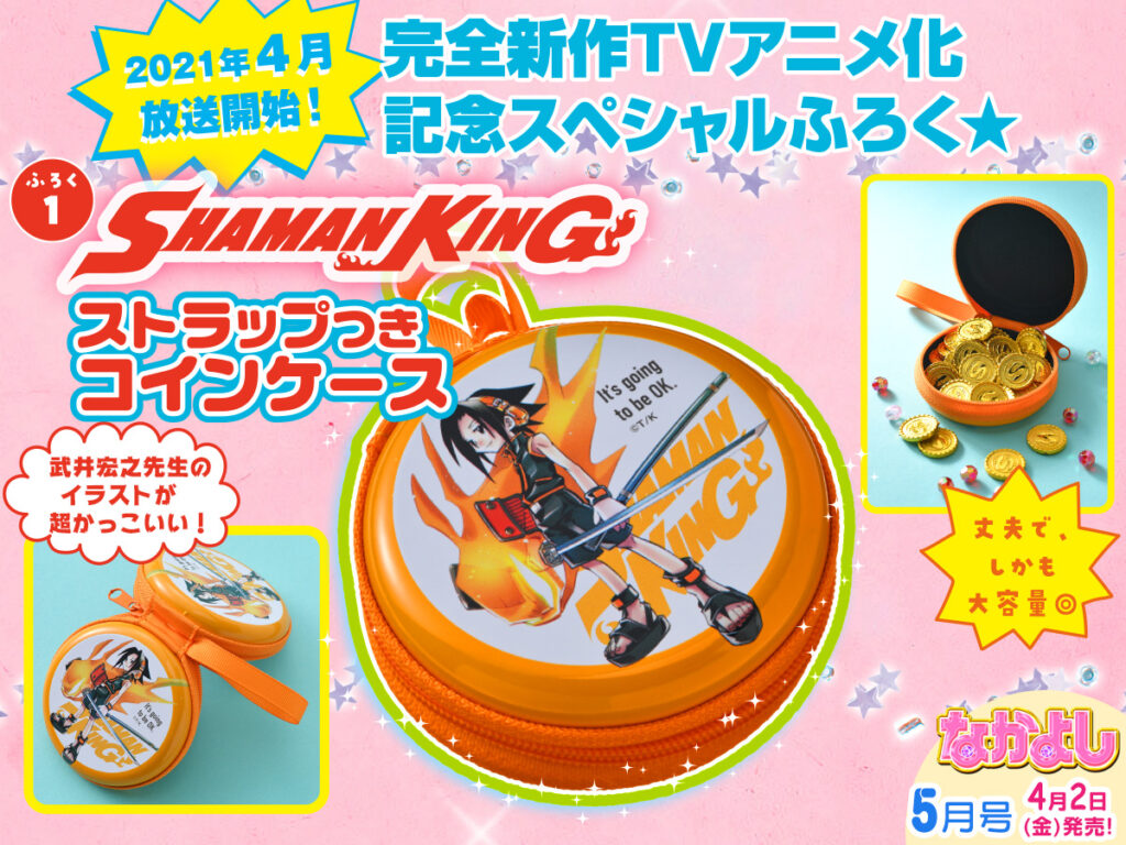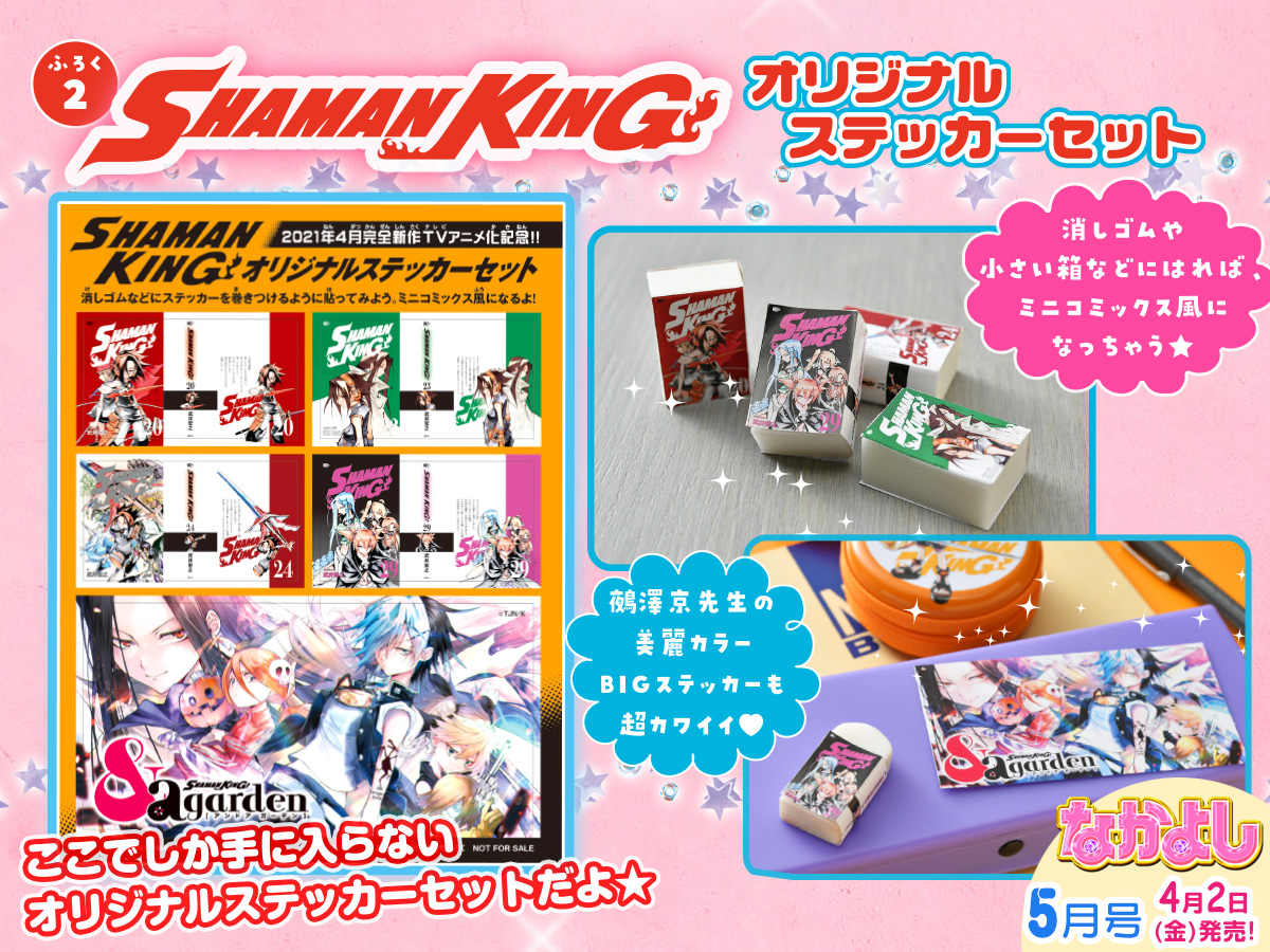Friday is also a big day for some collaborations. First up is Nakayosi Magazine will have it’s 5th chapter of Shaman King: & a Garden. If you pick up the physical issue of the magazine it will also have some extra bonuses of a coin purse and stickers for holding your erasers. Plus there is a color page for & a garden (shown above) and if you can’t wait for the chapter, there is a free preview on their website right now (for one month).