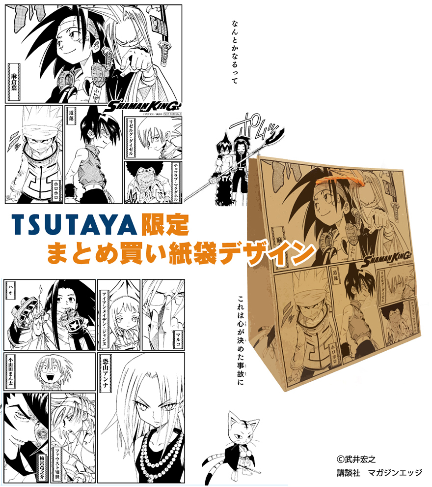 Starting on April 12th, Tsutaya Bookstores across Japan will be holding a special manga promotion within their physical stores. They have created a bundle of the first 10 volumes of the Shaman King manga which comes in a new paper bag featuring designs from the manga. The bag can not be purchased separately and this special promotion will only last as long as the bags are available. The bag design, shown above, has artwork on 4 sides of the bag.