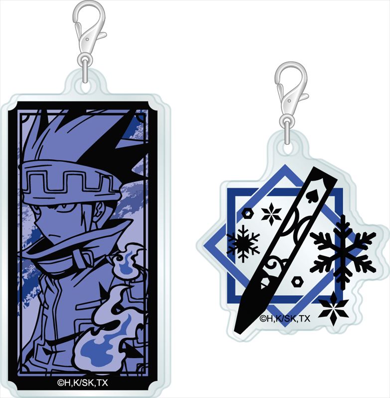 Each sold separately. The name is a combination of “asymmetry” and “acrylic” where you get two different designs of acrylic keychains in a single set.