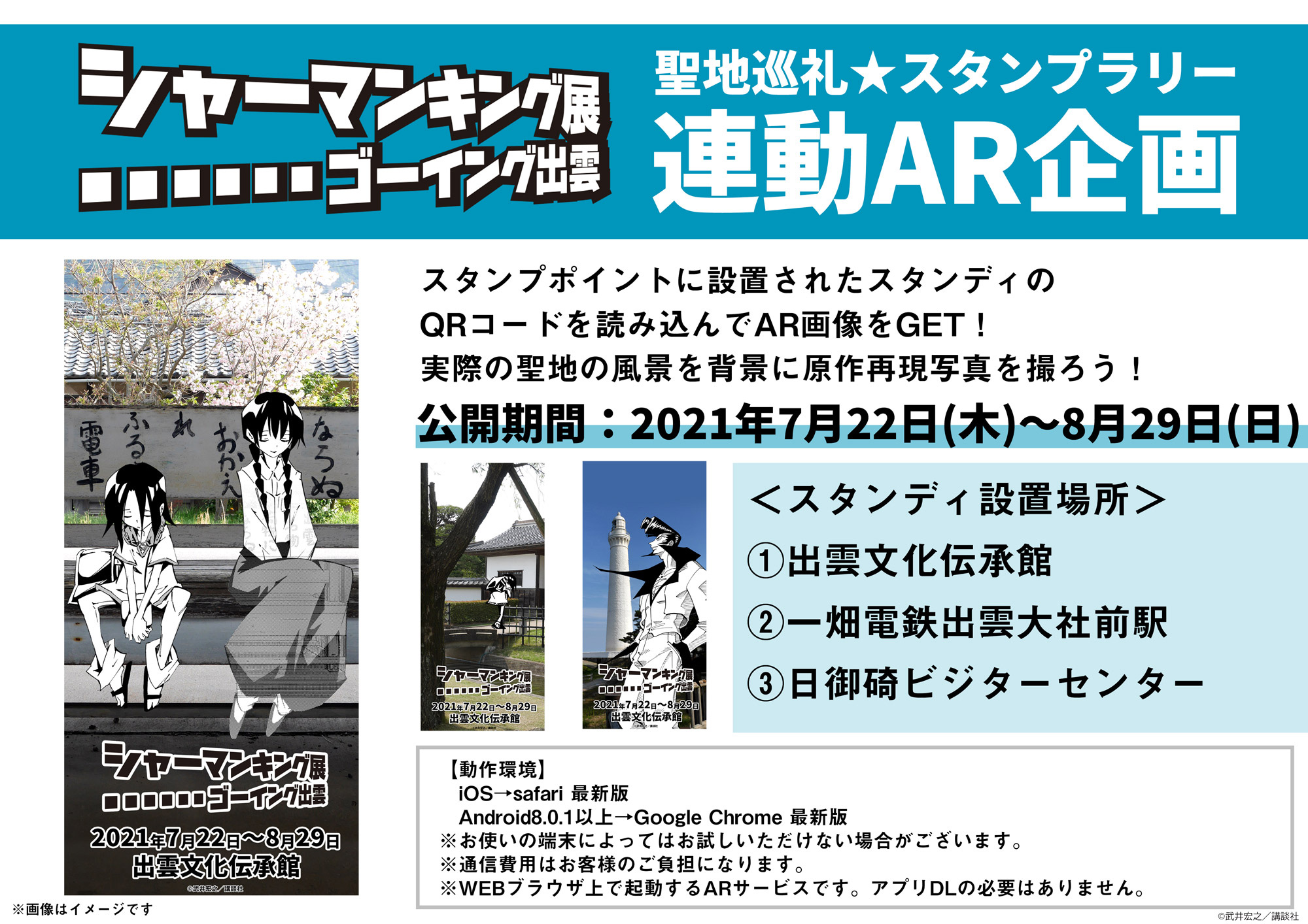 During the Izumo Exhibition (July 22 through August 29) there will be several locations around Izumo you can travel to during your stay. At 3 of the locations there will also be a special QR code you can scan to get a special AR design where you can insert Shaman King characters into the real-life locations. At each location there is a special card and stamp you can mark for reaching the destination. Note that some destinations may be limited in the hours you can visit.