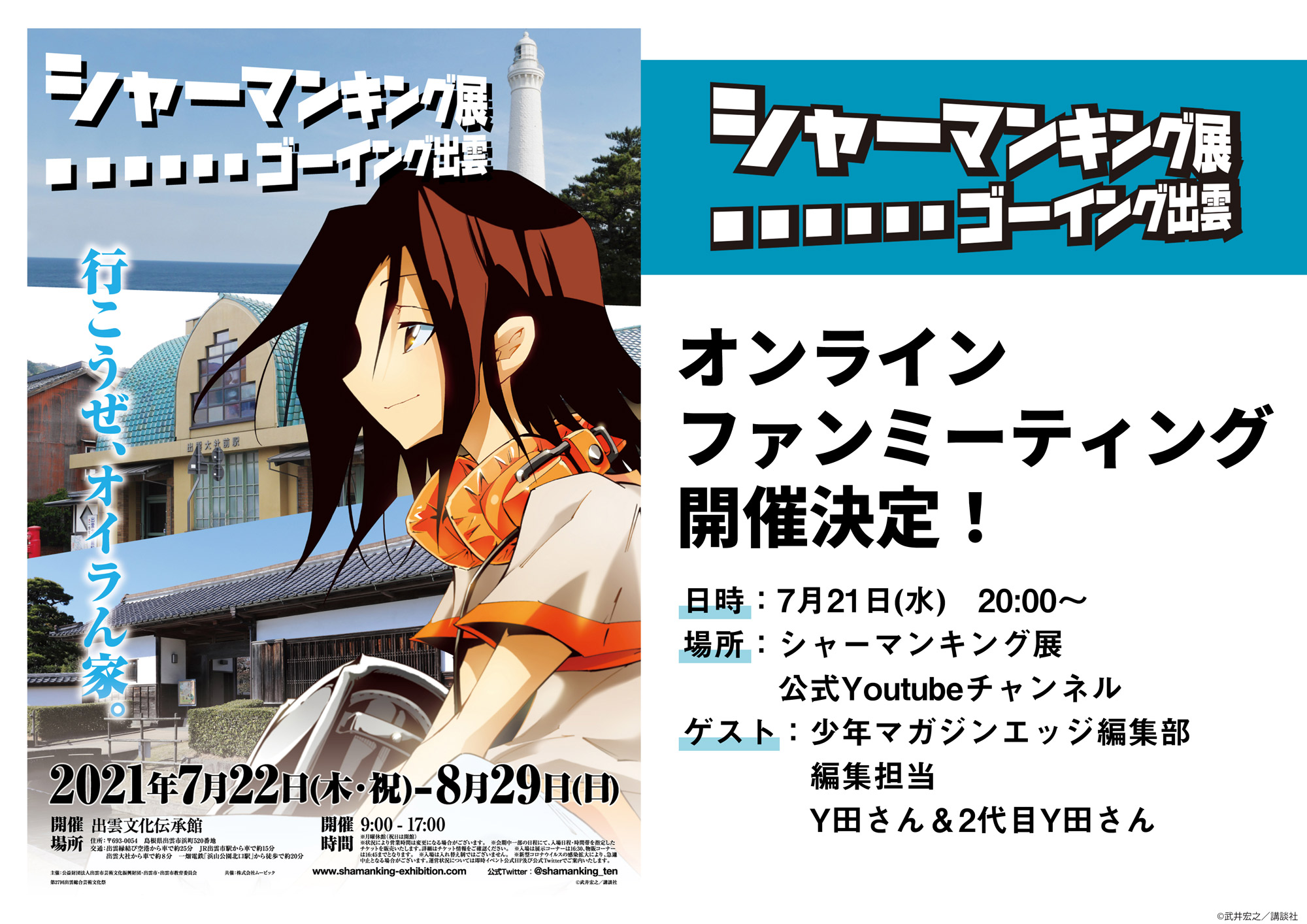 Taking place on July 21, 2021 at 20:00 there will be an online stream for an online meet-up prior to the start of Exhibition. The stream will be available from their new YouTube channel. The stream will be hosted by Hiroyuki Takei’s manga editor “Y-da” (Moriyoshi Yoshida) and the “Second Generation Y-da”, who is most likely Akiko Yada, one of the Producers from King Records working on the new Shaman King (2021) anime. The stream will be in Japanese, but will likely be available for worldwide streaming.