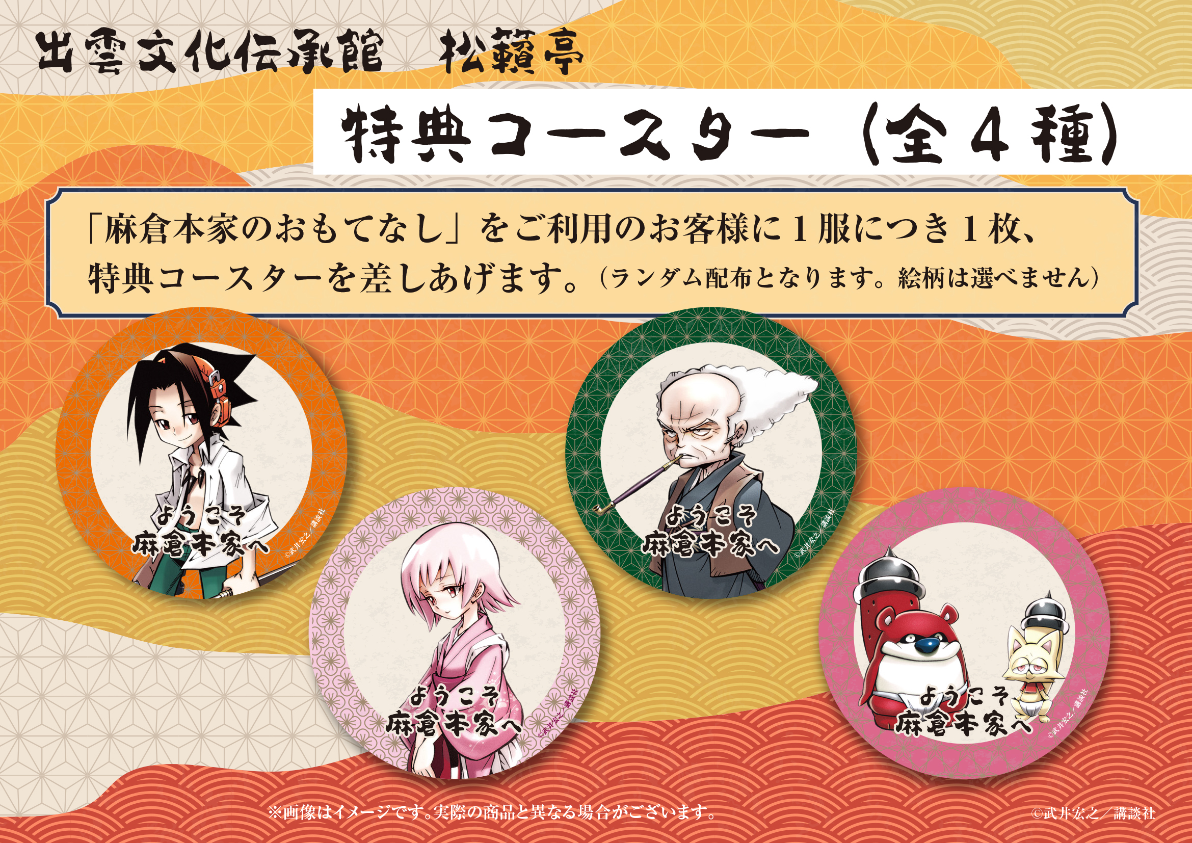 During the event period, there will be Shaman King inspired sweets on sale at the Izumo Cultural Heritage Museum’s Shorai-tei. With your purchase of these specialty designed treats, you will get a random coaster as well. The designs feature either Yoh, Tamao, Yohmei, or Ponchi & Conchi as shown below.