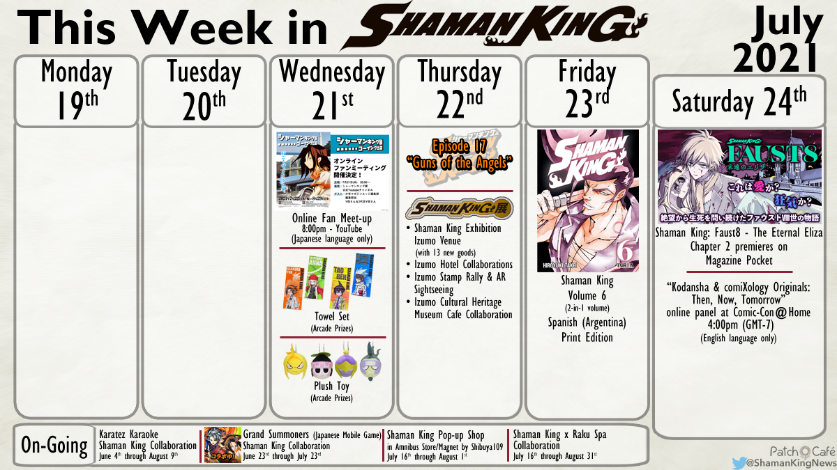 In terms of products coming out this week, there are 2 new sets of towels and plush toys that will be at arcades in Japan. The 6th 2-in-1 volume of the Shaman King manga will also be coming out in Argentina as well. Thursday will be the start of the Shaman King Exhibition in Izumo which will have 13 new goods for sale. An online “mail order” (pre-order) page will be opened at a later date. There are also a bunch of other collaboration events happening in the town at the same time.