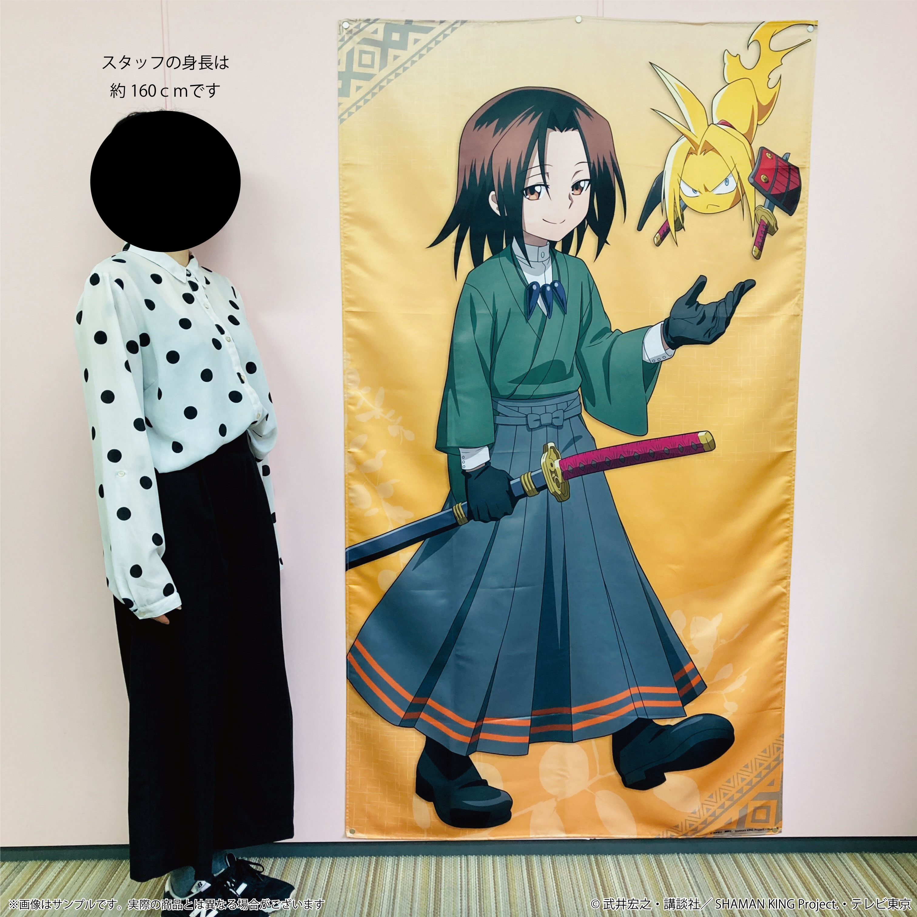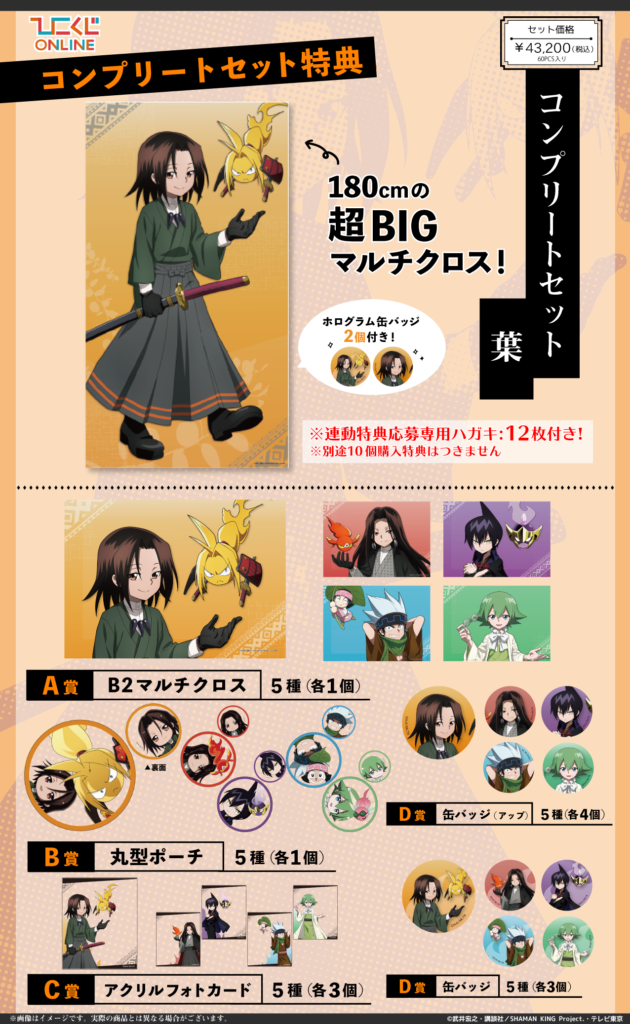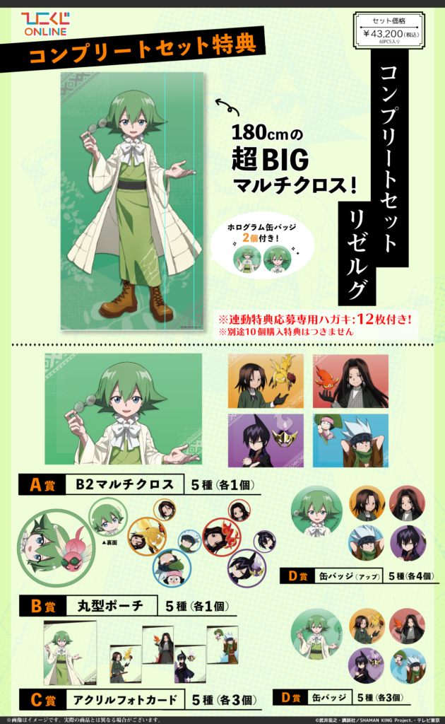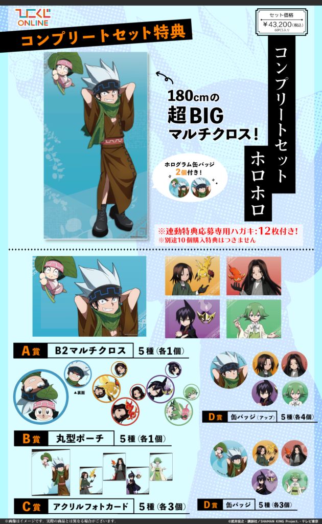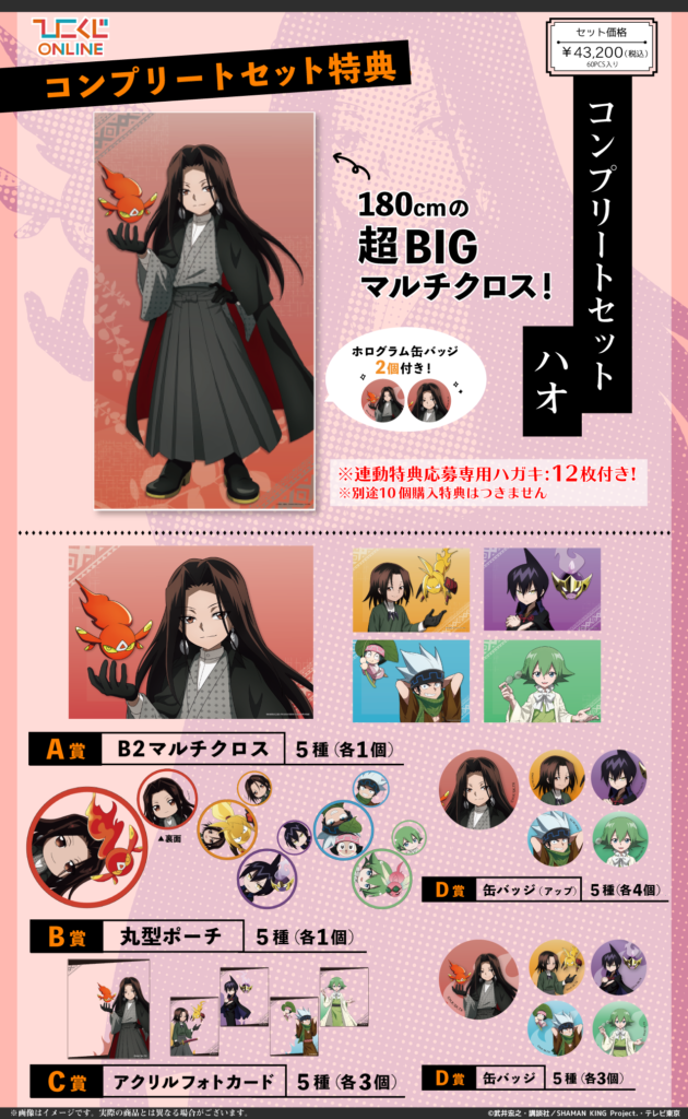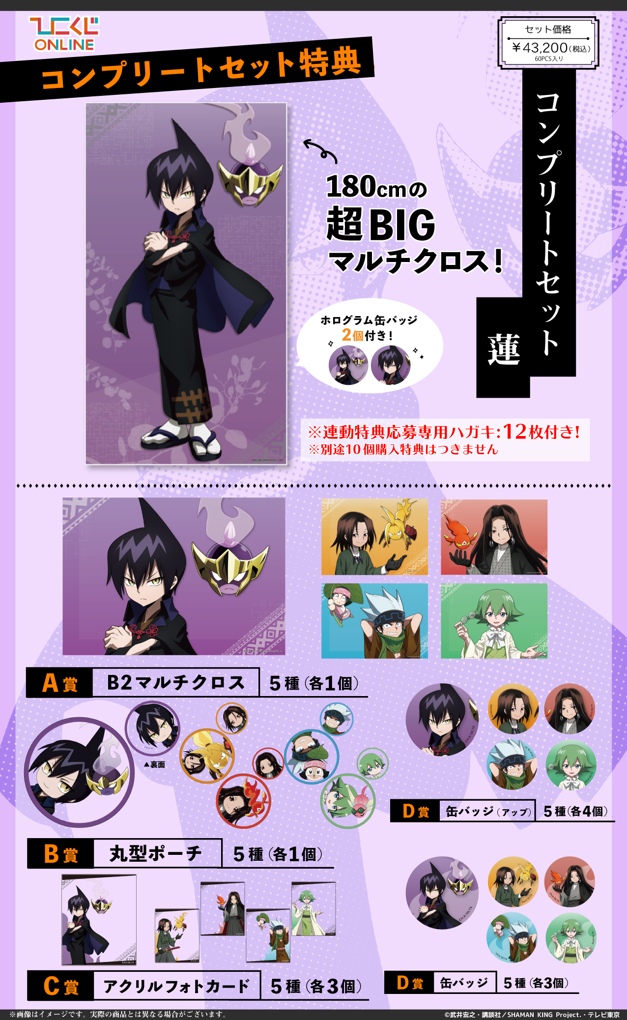 At the cost of 43,200 yen, you can purchase a complete set of the prizes. This will come with a 60 piece total set (plus 700 yen shipping). The contents will be the standard prizes listed above plus additional bonuses. The exclusive bonus is a large wallscroll/tapestry featuring either Yoh, Hao, Ren, Horohoro, or Lyserg. It is 180 cm tall.